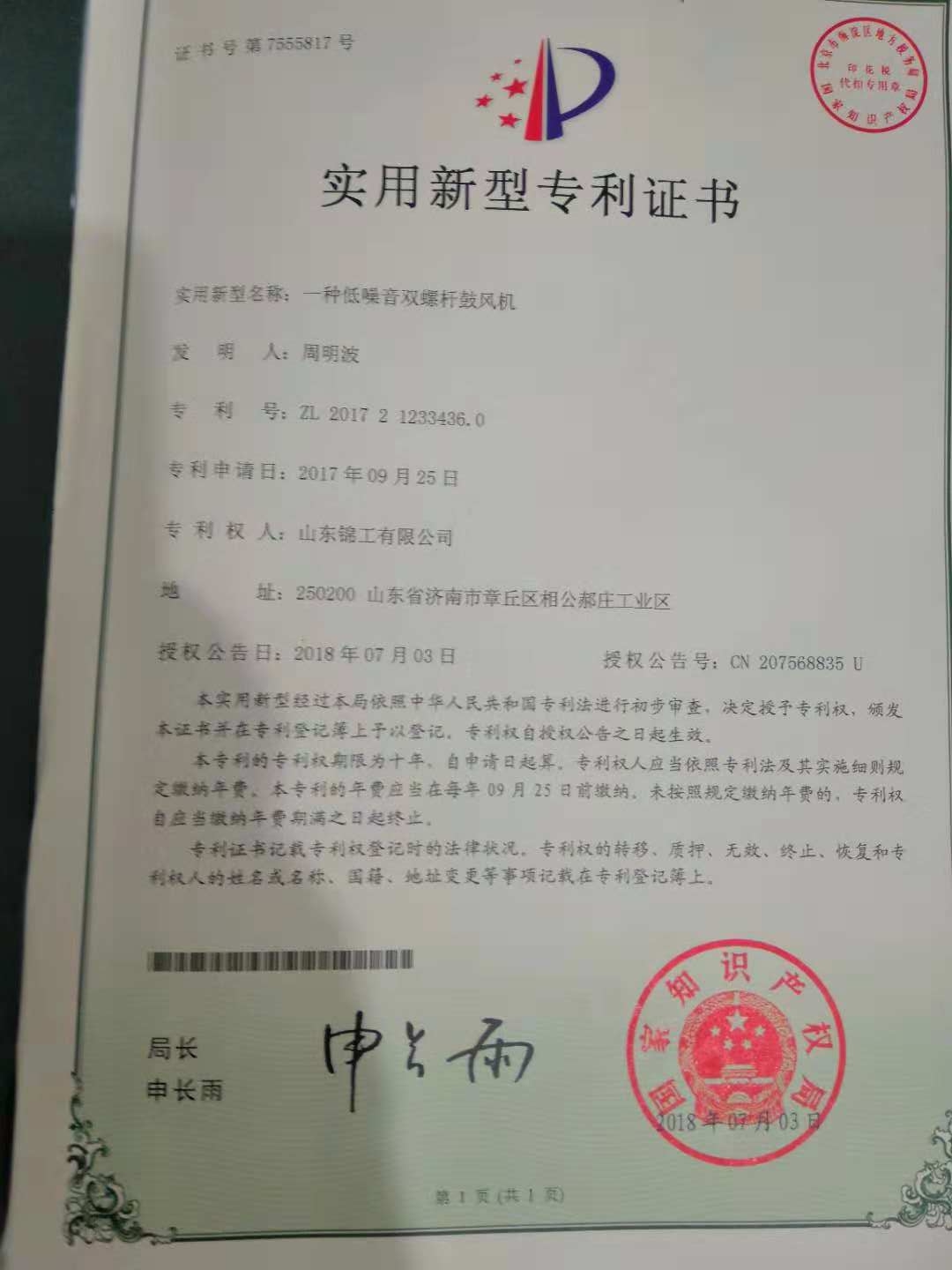 日前,錦工風機的“一種雙螺桿鼓風機” 、“一種緊湊型羅茨鼓風機” 、 “羅茨風機選型軟件” 等獲國家知識產權局頒發的專利及軟著證書。