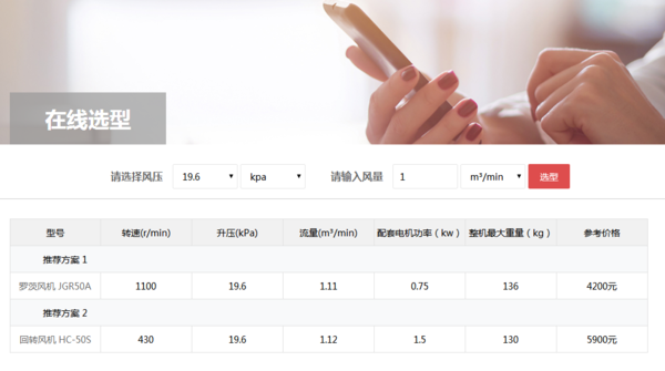 此外,還可以通過風機選型系統(tǒng)查詢回轉(zhuǎn)風機價格,如下圖客戶僅需輸入風量、選擇風壓,就可以方便、快速、準確、可靠地進行羅茨鼓風機、回轉(zhuǎn)式鼓風機等各類容積式風機的選型和價格查詢工作。風機選型系統(tǒng)地址:http://www.ganmulun.com/search.php