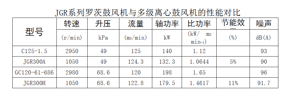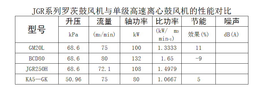 (2)JGR系列羅茨鼓風(fēng)機與單級高速離心鼓風(fēng)機能耗比較: