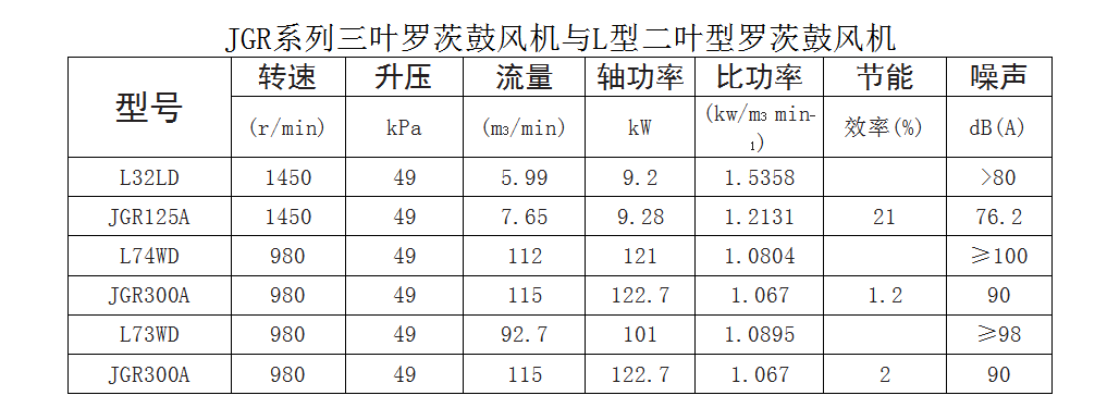 (3)JGR三葉羅茨鼓風(fēng)機與L型二葉型羅茨鼓風(fēng)機及國外三葉型羅茨鼓風(fēng)機的性能對比:L型二葉羅茨鼓風(fēng)機是80年代中期,當(dāng)時的機械工業(yè)部組織全國幾家重點羅茨鼓風(fēng)機生產(chǎn)廠家聯(lián)合設(shè)計的節(jié)能產(chǎn)品,列入國家第八批節(jié)能產(chǎn)品目錄,JGR型三葉羅茨鼓風(fēng)機是山東錦工有限公司自主研發(fā)的產(chǎn)品,兩種產(chǎn)品的性能對比如下表。