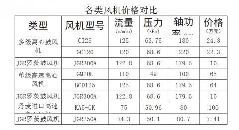 各類風(fēng)機價格對比如上表所示。從上表可看出JGR系列三葉型羅茨鼓風(fēng)機的價格是多級離心鼓風(fēng)機的1/2不到;是國產(chǎn)單級高速離心鼓風(fēng)機的1/5不到;是進口單級高速離心鼓風(fēng)機的1/12不到,因而在價格上JGR系列羅茨鼓風(fēng)機有絕對的優(yōu)勢。