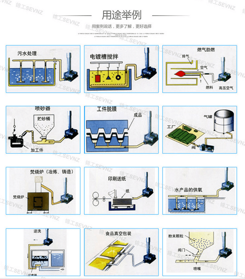 廣泛用于污水處理、水產養殖、氣力輸送、真空包裝、洗煤、助燃、增壓、鑄造、礦山、冶金、化工、輕工、建材、電力、面粉、噴砂、真空等。