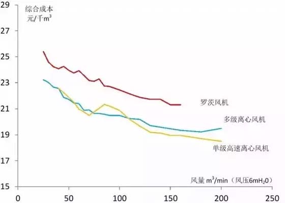 其中,羅茨風機由于能耗較高,單位流量綜合成本高于多級離心和單級高速離心風機。在100m3/min以上的流量時,由于單級高速離心風機具有更高的運行效率,綜合成本優于多級離心風機。